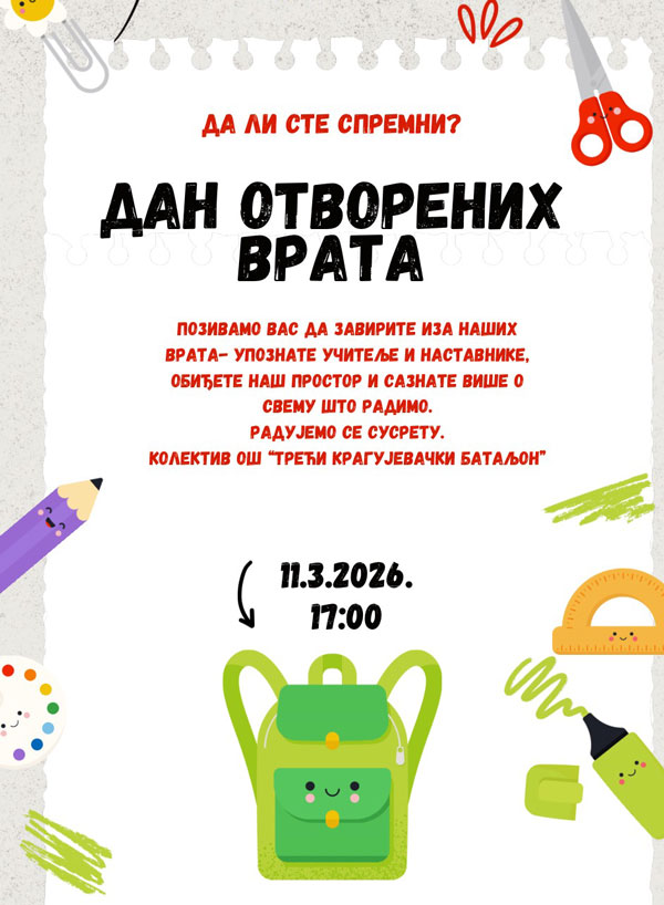 Наставничко веће ОШ „Трећи крагујевачки батаљон“ у Крагујевцу је на својој седници одржаној 5.2.2026. године донело Одлуку о покретању поступка избора уџбеника за четврти и осми разред које ће користити у наставном раду од школске 2026/27. године.